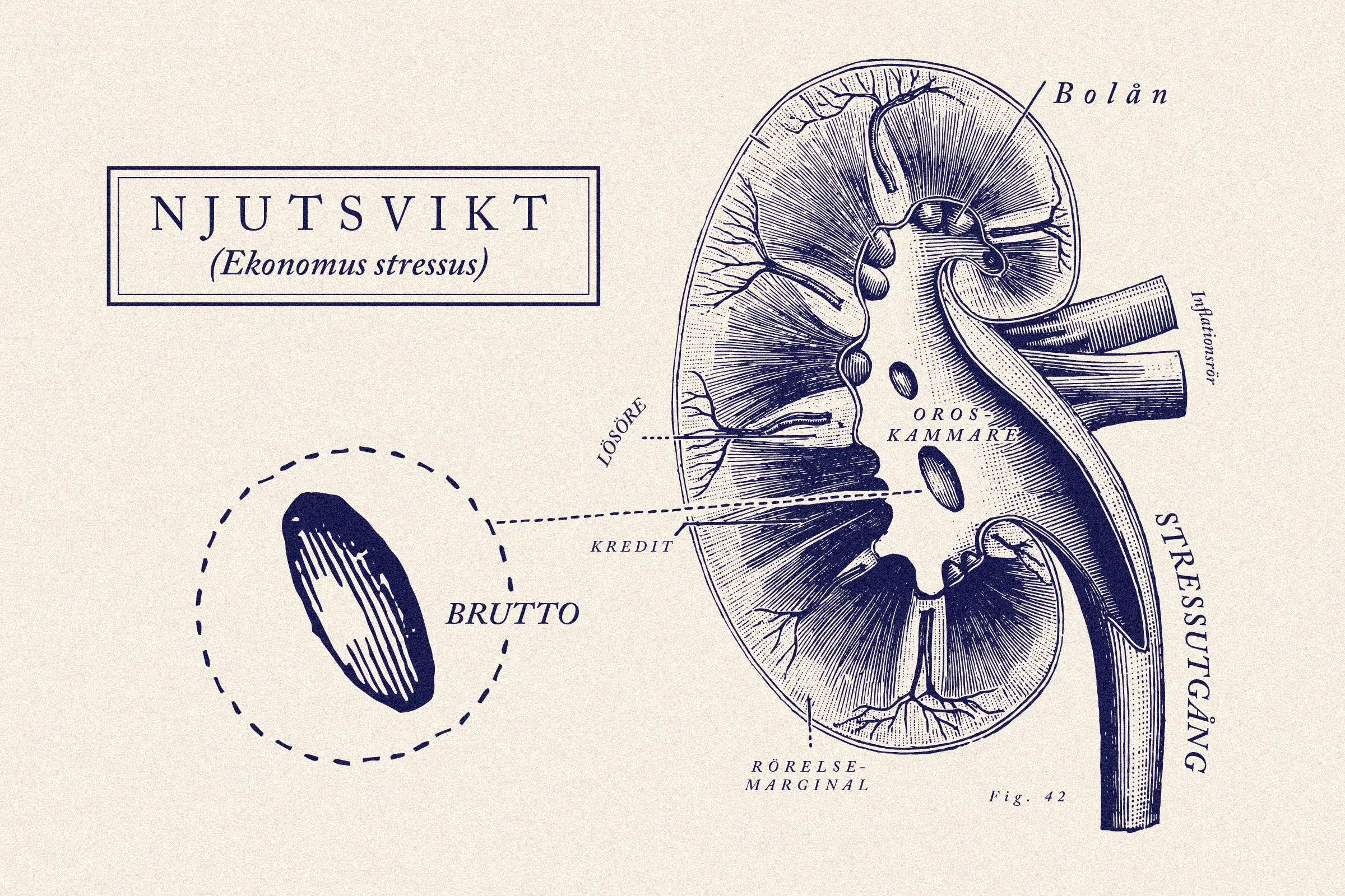 - Symptom: Njutsvikt kännetecknas av en extrem stress och oro kring tankar om pengar och ekonomi. Symtomen märks oftast i form av hög puls, yrsel och axelvärk. Det är heller inte helt ovanligt med sömnproblem.